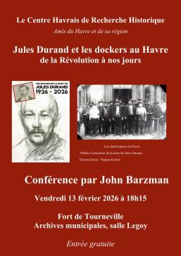 Le CHRH présente, le 13 février 2026, à 18h15, salle Legoy des Archives municipales, Fort de Tourneville, une conférence « Jules Durand et les dockers du Havre de la Révolution à nos jours...